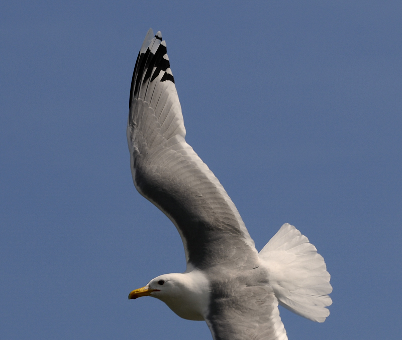 5000, 5001 and 5002: now this one had me astonished most. either is it pretty retarded - with short p10 tongue, many dark underwing markings and a full and broad tail band(!), plus there seems to be only a small p10 mirror, unfortunately not well visible, only in pic 5002. a similar pattern often is found in same aged michahellis (but p10 mirror usually differently shaped and ventral p10 tongue slightly shorter or absent) or - maybe in eastern types of cachinnans??? such birds seem to occure in romania and central europe with a certain regularity, unfortunately we don't know their origin.