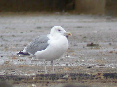 It has only black on outer edge of p5, but also on left wing a little black spot on p4, extensive grey tongues on the five outer most primaries, all white tips to p10, darker upperparts than argentatus, when seen on water it gives a classic cachinnans jizz with rather small head, slender elongated rear and flat back, but when seen standing on ground it gains some argentatus appearance due to head profile and body.